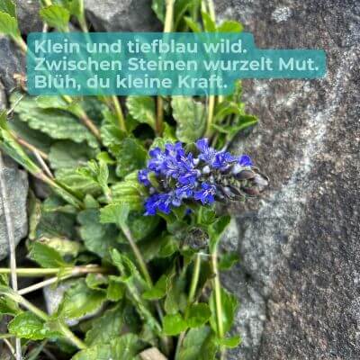 - Im Granit wächst plötzlich dieses entschlossene blaue Pflanzending – gänzlich ungeplant und schön.